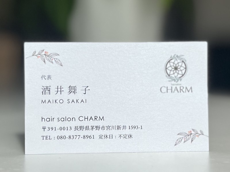茅野市の美容院「CHARM」様の名刺兼ショップカードをデザインさせていただきました。